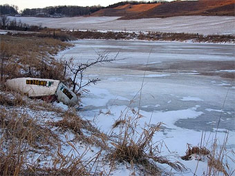 Last week we walked through all the rooms of the barn, an old red one a previous owner saved by tinning the roof. Because some doors were lodged shut, we had to climb over troughs, feeling the smooth valleys in the edge of the wood from the sturdy necks of animals who fed there. Up in the hayloft, mud dauber and barn swallow nests lined the rafters, all quiet in the twenty degrees of January. We own several bales of something, straw or hay, which we don’t know the first thing to do with. A window on either end of the hayloft swings open, one facing the south fields and the hills beyond them, and one overlooking the pond to the north. We talk about sweeping out the neglect up there—another item for the list of things to come, which is already several years’ worth. Down at the edge of the frozen pond we stumble on the remains of a wooden rowboat, a skeleton really. It is the third boat we have found on the property. Two wood duck nests dangle on posts, one with the floor and roof missing. My husband walks out across the ice, learning the size of this body of water, and I skirt the edges, walking where the two-toed deer have left their prints.