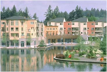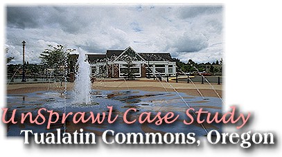 The site is highly visible for commuters, with 30,000 vehicles passing by daily. Though the market was poor in 1991 and 1992, it was on an upswing in 1993, and there was growing market opportunity in nearly every sector. While private financing restrictions placed much commercial construction on hold for several years, the demand continued to grow, and Tualatin Commons effectively tapped into that demand. Major environmental benefits have resulted from the Commons. First, the noticeably repulsive odor of the pet food factory has been eliminated. Second, two acres of impervious streets and their associated traffic, noise, and automobile emissions have been replaced by a 3-acre lake. In act, traffic volume has been reduced by 40 percent in the Commons area compared to standard retail and prior uses. And third, the lake has alleviated the historic problem of the area being below the 100-year floodplain. In constructing the lake, fill was used to raise the surrounding parcels to higher levels. Additionally, in demolishing the buildings, concrete was recycled into the lake walls, promenade, and public plaza walkways. Perhaps the largest real measure of success is the fact that Tualatin now has a city center that has created a sense of pride in the community. "I think it will have a much bigger impact than just the 20 acres," said a member of the Development Commission. "We are going to see almost a renaissance occurring outside the boundaries of the project. But it's going to start slow." Within the Commons, however, a renaissance has already taken place, giving the once-centerless Tualatin a heart, and giving its residents reasons to fill their own hearts with a sense of joy and sense of place. "It is one of the most exciting things in my life," said an original member of the Urban Renewal Advisory Committee. "We could see it coming. Here was an opportunity to make a place where people can feel that the community belongs to them, a community made up of people who live and work there." That is indeed unsprawl. For more information, visit the Tualatin Commons (West Coast TND) website at www.tndwest.com/tualatincommons.html.
