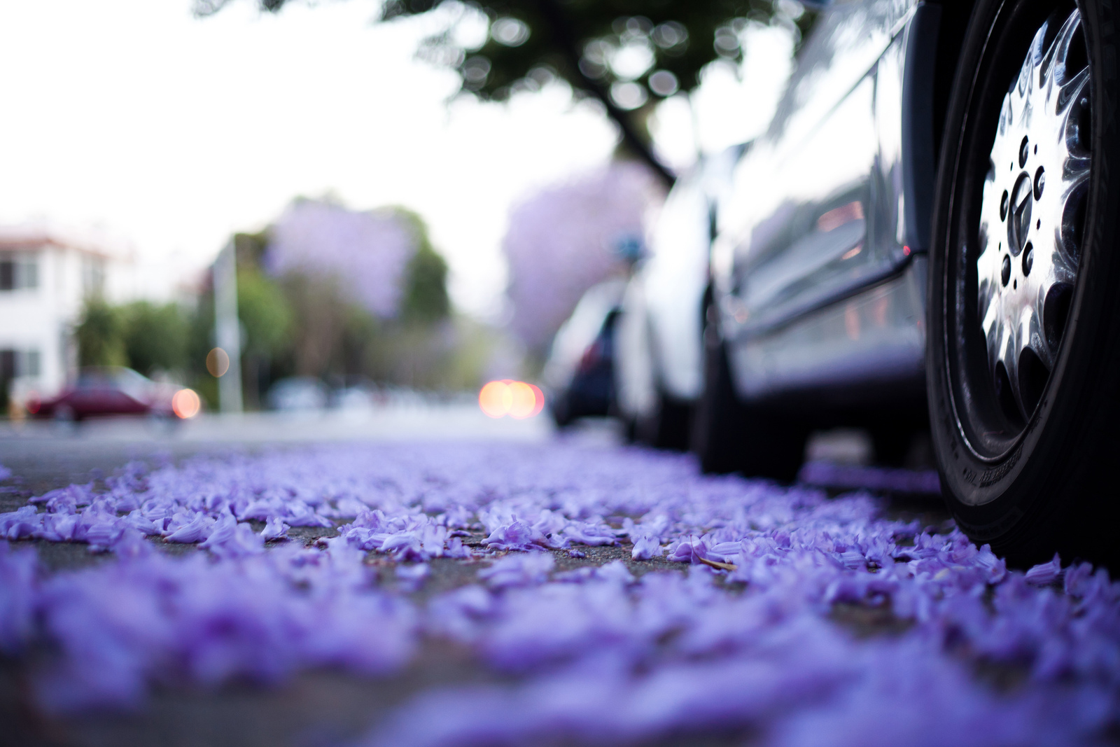 Jacaranda trees bloom like lightning strikes.