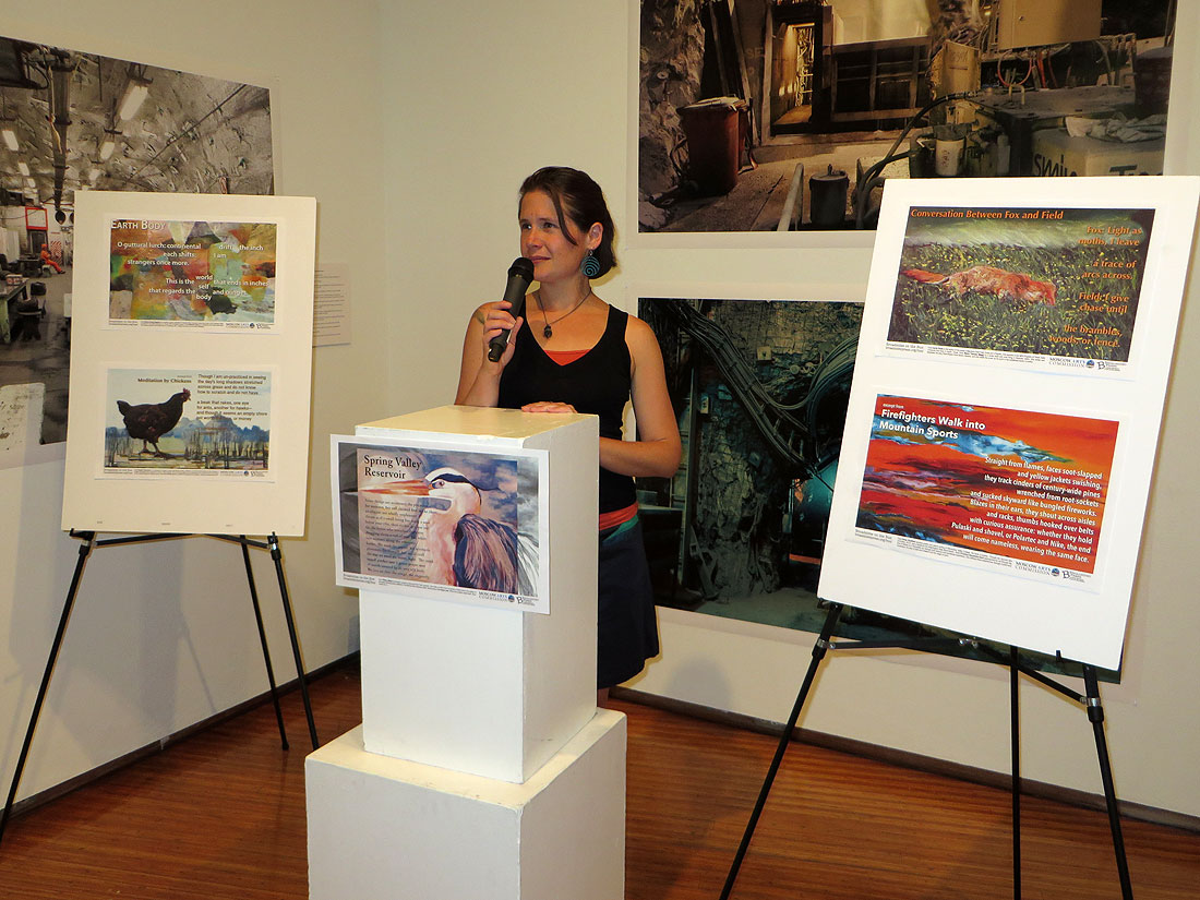 More importantly, whoever stepped onto a bus in Moscow had an opportunity to consider the wildfires burning in the state through the lens of a poem by Derek Sheffield plus art by Christine Alexandre-Zeoli. They could meditate on the interior life of a factory-raised chicken compared to its wilder counterparts through a poem by Stephen Siperstein plus art by Chris Pavlik. Cecily Parks’s poem about the dynamic between wild and tame, fox and field, was given orange skulk by Maria Theresa Maggi. Kristin George Bagdanov’s poem and Katherine Clancy’s art explored the tectonics that shift within our bodies. And Moscow’s first poet laureate, Tiffany Midge, took us deep into the local bird life of the Spring Valley Resevoir along with a painting by Ryan Law. The collaborations were a window into how we view landscape, how local impressions of light and color can be in conversation with writers from other landscapes.