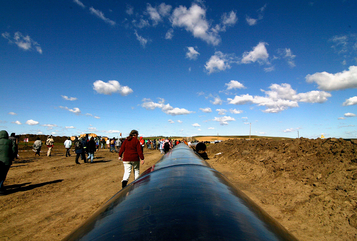 Last noise before sleep: snapping flags. Hundreds of tribal flags line the camp’s entrance. More than 300 tribes have rejected Dallas-based Energy Transfer Partners’ North Dakota Access Pipeline, a 1,200-mile tube that will move a half million barrels of Bakken oil per day from North Dakota to Illinois. Earlier, they recast the pipeline’s route from its original crossing of the Missouri River near Bismarck, to within a half-mile of the Standing Rock Sioux Tribe Reservation. Here it would burrow under the Missouri, digging up burial sites, cutting through sacred lands, and endangering critical water sources along the way.