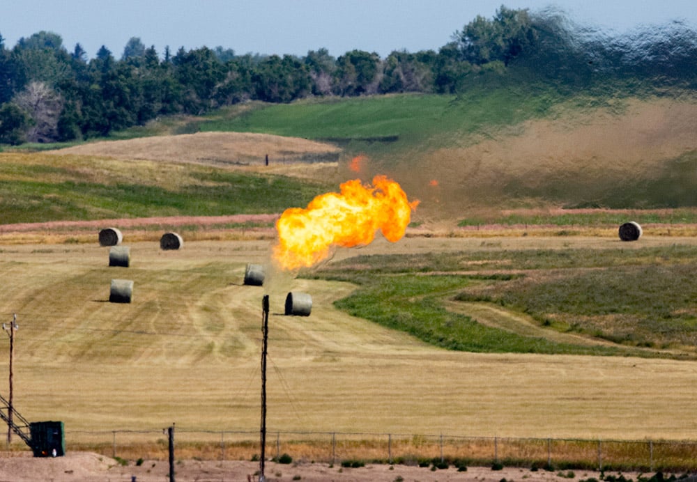 Other ancient items are emerging from this ground as well. The most jarring sight in the plains of western North Dakota is the abundance of fracking pads and oil well pumps, slogging away like mechanical grasshoppers every mile or so along every road. Many of these installations are embellished with tall pipes, spouting massive gas flames at the top. The Bakken oil field here has a lot of natural gas as well as petroleum, but this region is too far from most gas pipelines to allow the drillers to make money from much of the gas, so some of it is just burned off, 24/7, across this vast landscape. Nighttime satellite photos of the continental U.S. are usually images of cities and towns connected by glowing spiderweb threads of interstate highways, but in recent years a very large bright spot also shows up in western North Dakota, far from any city, and entirely due to the gas flares which now populate the landscape like miniature Isengards. No one seems to pay them any attention; it seems that they are part of the literal and cultural landscape now.