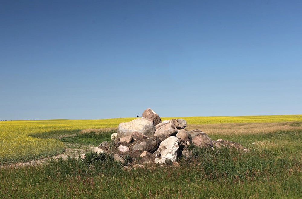 One of the striking aspects of the western Dakotas is an abundance of piles of large rocks, in the corners and in the middle of the fields; there are often several in sight from any vantage point on this sky- and grass-filled plain. They resemble the Neolithic tombs that I saw in the Outer Hebrides a few years back, jumbled heaps of boulders with little obvious internal or external organization. In fact some of them are ancient burial sites, but most are more recent and more mundane. The rocks, ranging from several feet across to a few inches, are glacial erratics—boulders which migrated south during the Ice Age and stayed behind when the ice retreated. Folks who first wanted to farm these prairies had to remove the rocks before they could plow, and still have to do that regularly. Winter cold and spring thaws heave buried boulders to the surface every year, and “picking rocks” is an ongoing pastime for Dakota and Montana farmers. Mechanized pickers with inspired names like Rock-o-matic, hauled behind tractors, replacing the horses, wagons, and manual labor of the pioneer era, make this task easier nowadays. But I imagine it is still hard work, and not something that teenage farm kids look forward to every spring. It might be Making America Great Again, or it might just be a Sisyphean effort to keep running in place, like we all seem to be doing.