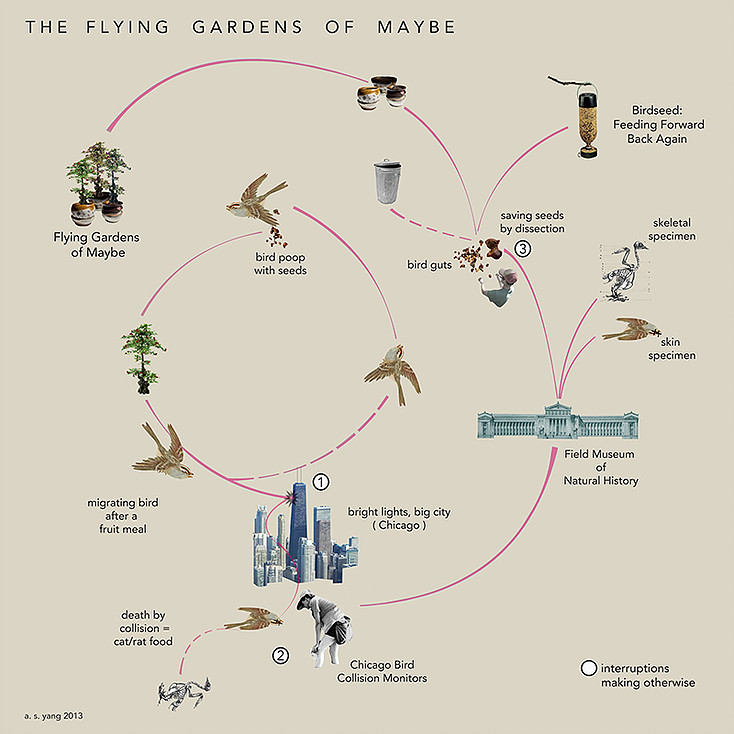 What does that look like, exactly? In his exhibit “Makeshift Geologies (an Anthroposcene)” rocks and trash collected on a walk in the Monserrat mountains sit side-by-side with collaged drawings of stones, a “collection” that asks after the interplay between art and wilderness, represented and real. In “New Economies / Anachronistic Fruit” playful research and gallery performance propose a new economic-ecological niche for the Kentucky coffeetree in the post-industrial Chicago landscape. In “Flying Gardens of Maybe” Yang maps the “interruptions” that mark the interactions between birds, rats, skyscrapers, scientists, museums, and art audiences, looking for points of intervention and repair. And these are just his gallery projects. Yang also writes and edits essays and zines, delivers performative lectures, curates art shows and panels for science symposia, and spends time interrogating education and his own teaching practice.