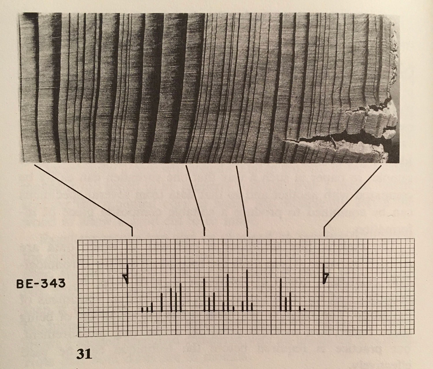As I practice tree ring dating I come to expect certain years to correspond to narrow rings: 1996, 2002, 2011. Years in which droughts restricted growth in trees in the Southwest. Another telltale pattern: the Flagstaff Signal, discovered by the father of dendrochronology, A. E. Douglass, who founded the Tree-Ring Lab in which I learn these skills.
