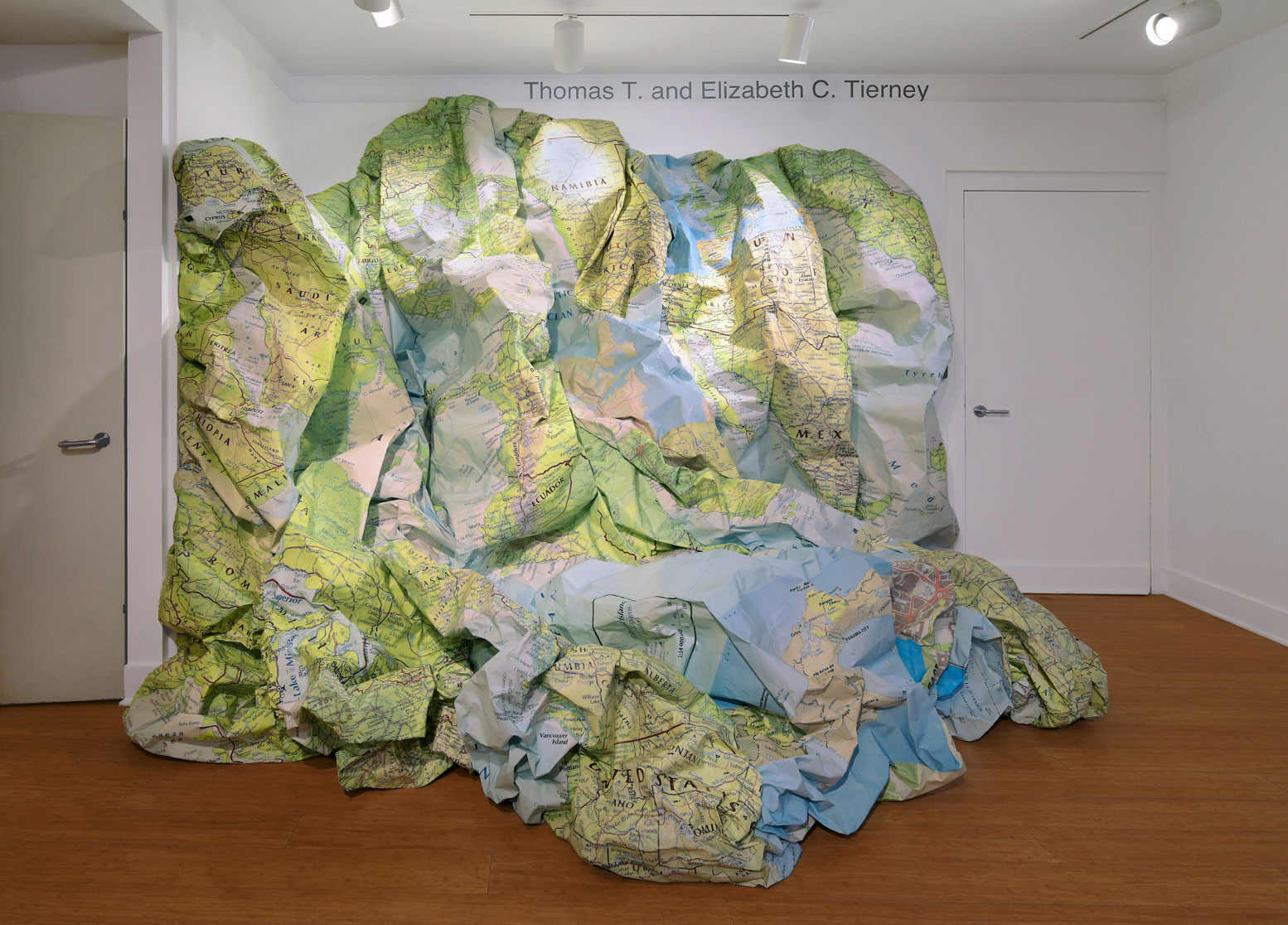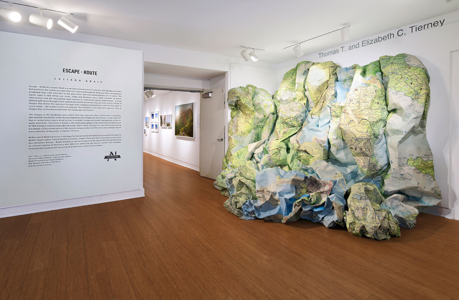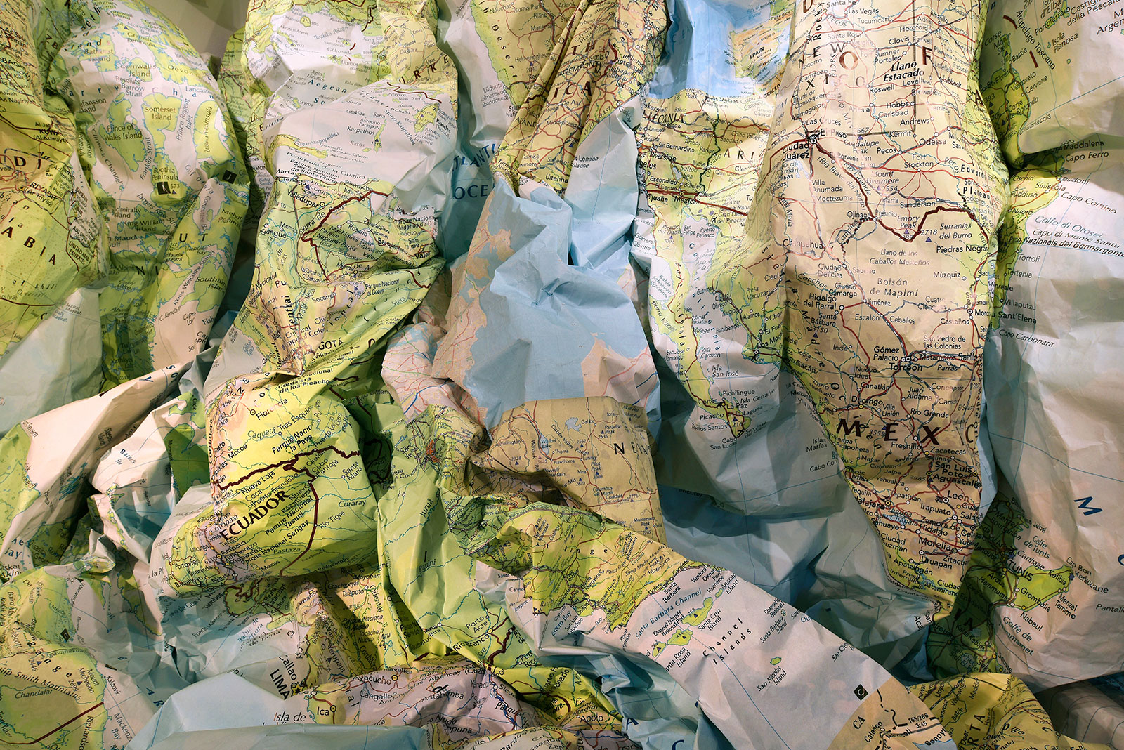 Escape-Route takes the spectator on a road trip. This journey begins with “The Maps that Failed Us,” a monumental paper installation. This work is an assemblage of maps of all the countries of the world jumbled together in random order. It shows how all humanity is interconnected, but one quickly realizes that navigation is complicated.