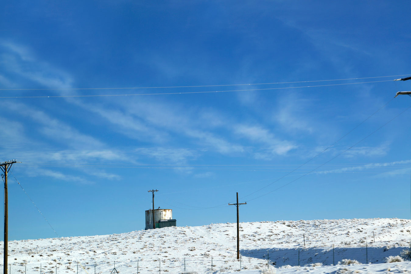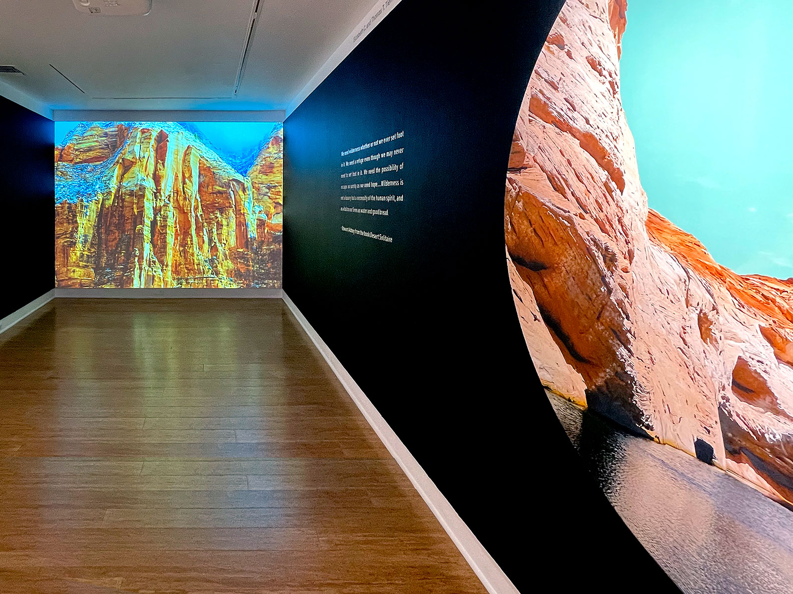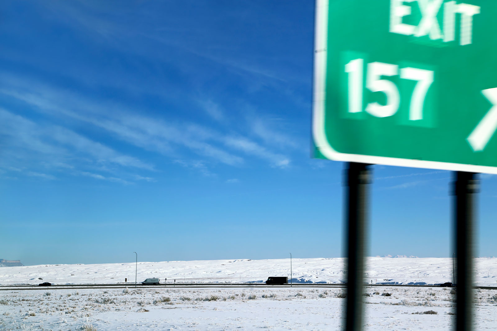 As spectators continue navigating the exhibition, images take the audience through new terrains. Snow-covered mountain tops and snowfields show the various topographies we find across the West. Road and traffic signs remind us about the presence of people, even in the most remote areas of the landscape. It’s hard to decide if this is devastating or reassuring.