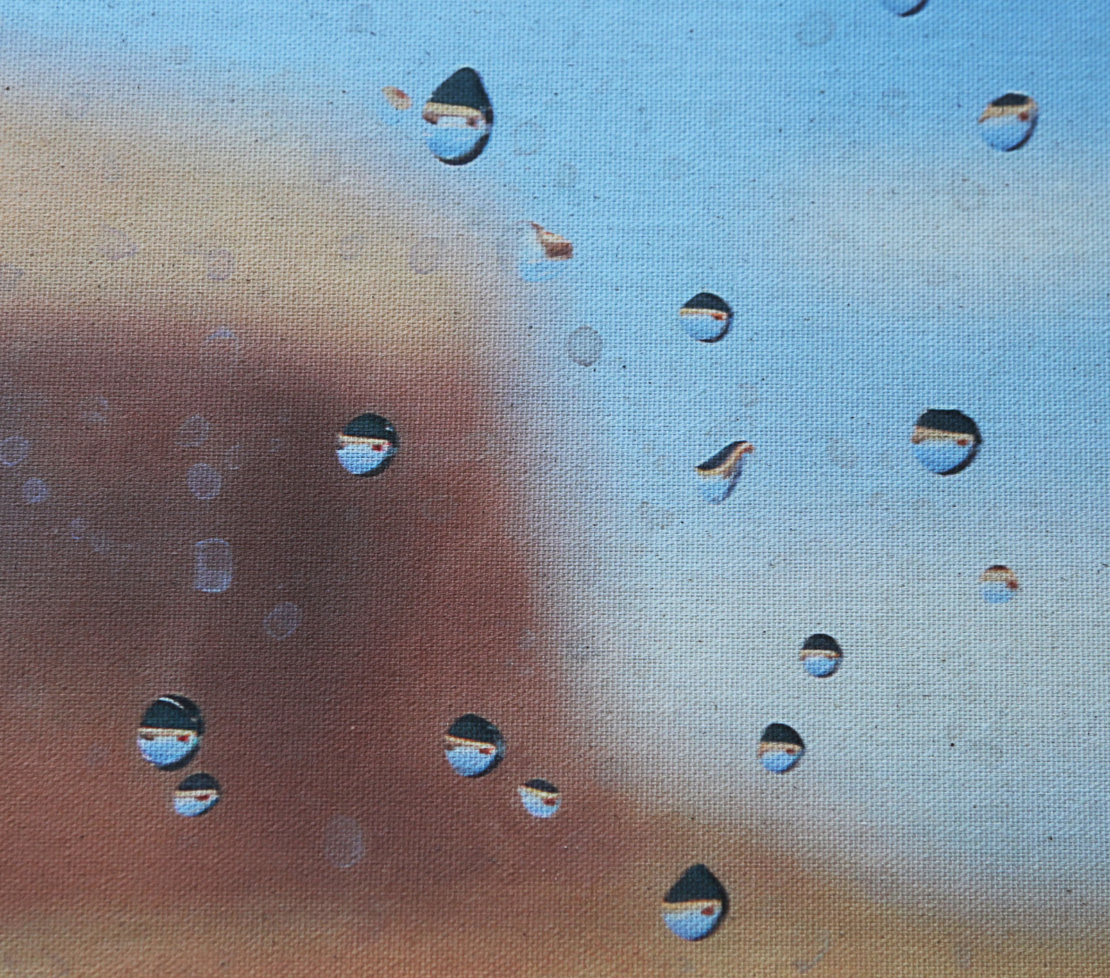 Throughout the exhibition, artworks look like simple landscapes when seen from a distance, but as we get close, we find surprising elements. In “Windshield II,” most of the water drops present an optical effect of a landscape turned upside down. This play between clear and blurry sight suggests that what we are looking at is not always straightforward.