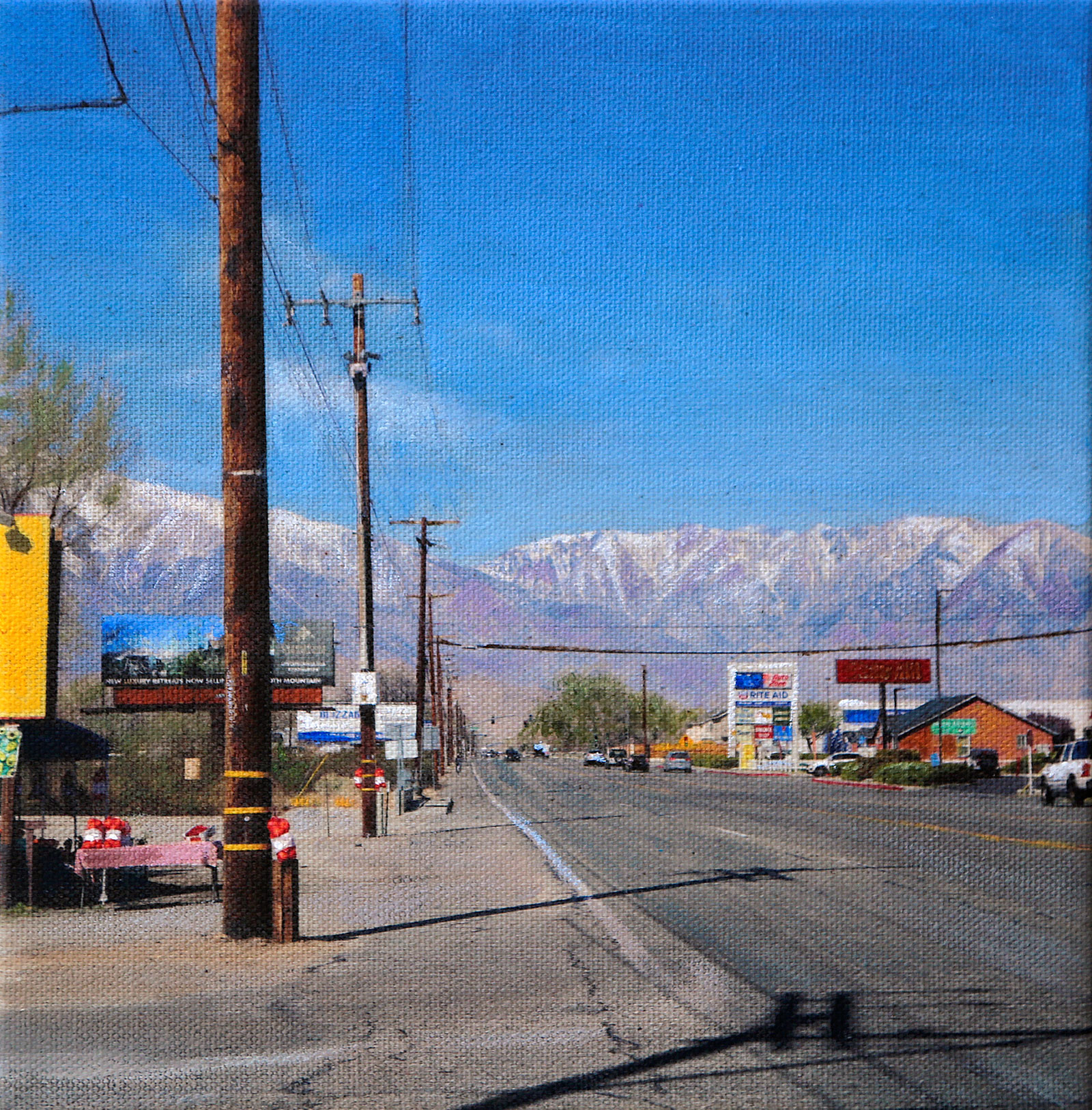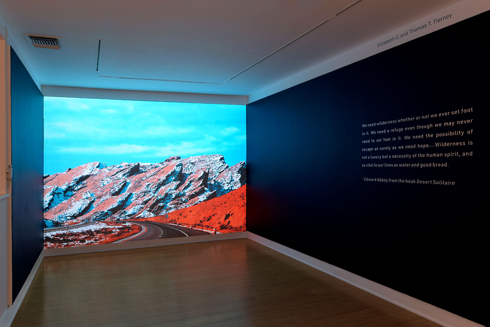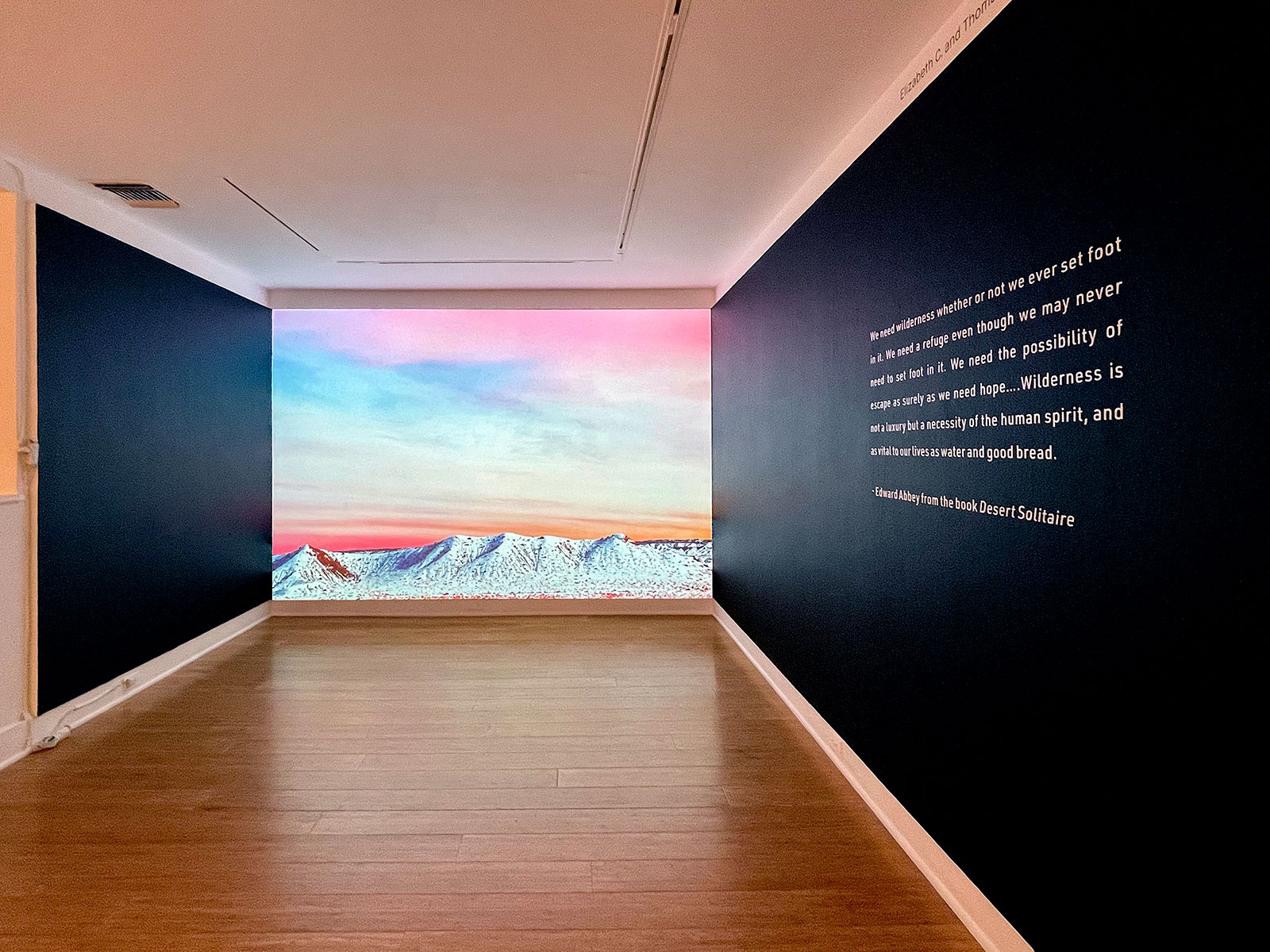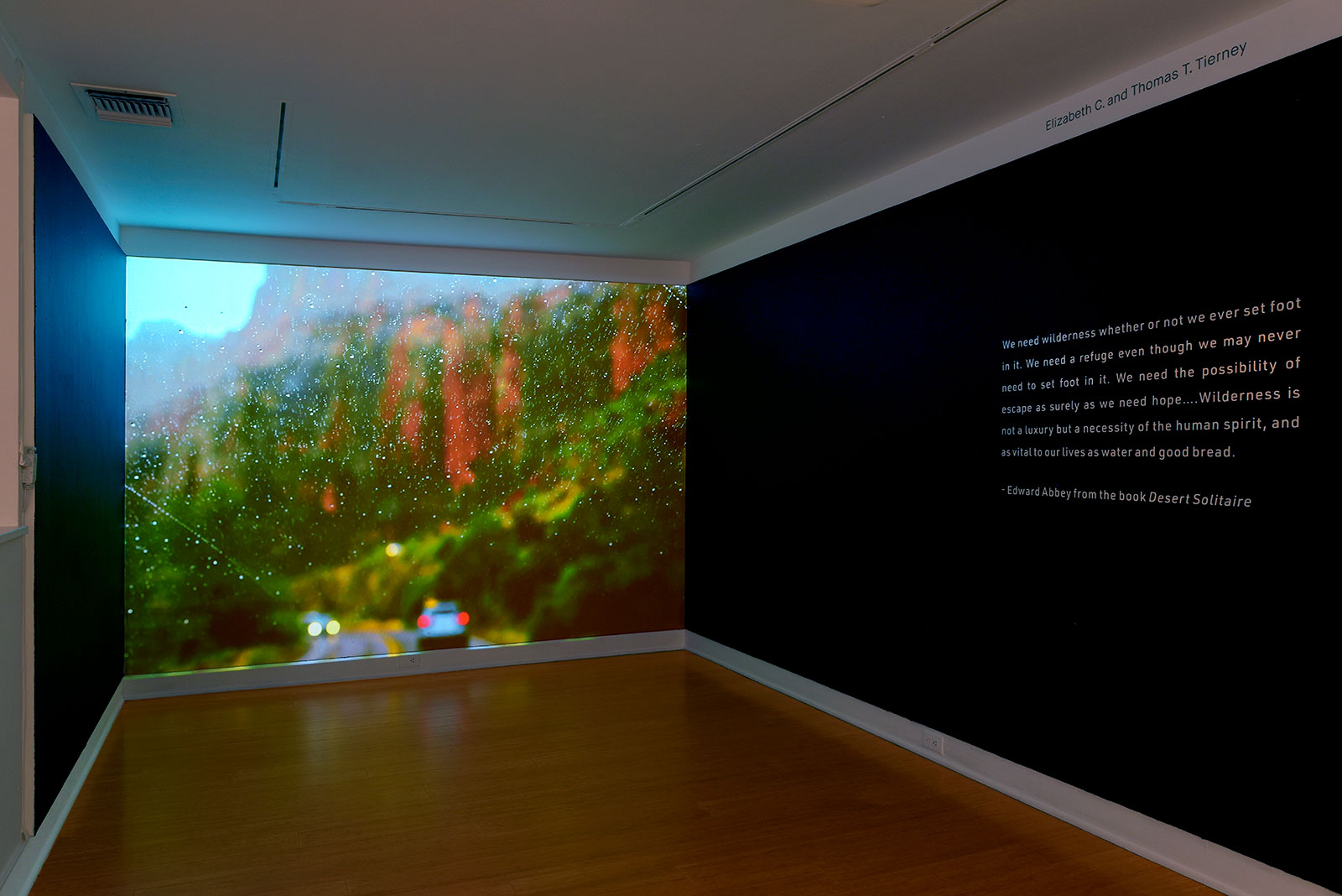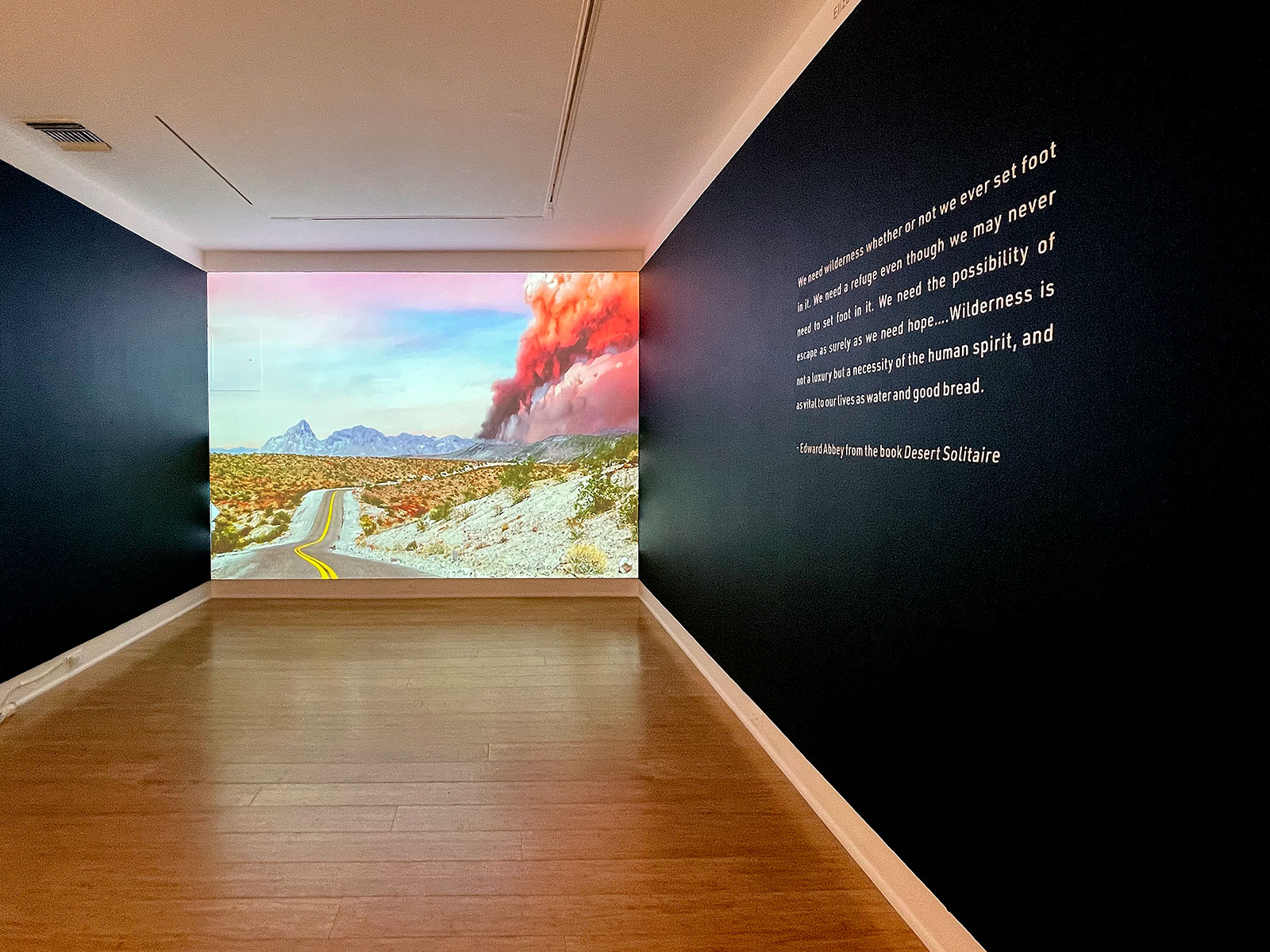The road trip through the exhibition and the search for water is not only a physical but also an internal journey of discovery and reflection. One of the primary themes that I address in my work is environmental change. The landscapes in Escape-Route show the beauty and majestic qualities of nature and how they’ve been changed by civilization. This is shown metaphorically in a video projection, “Road Trip,” which takes viewers on a surreal journey where landscapes have gone through a deep color alteration, symbolizing the changes that our environment has gone through. The altered landscapes eerily portray distortions that begin to feel like a trippy science fiction film and take viewers on an out-of-this-world, supernatural voyage that enables them to get lost and find a sense of possibility and of freedom.
