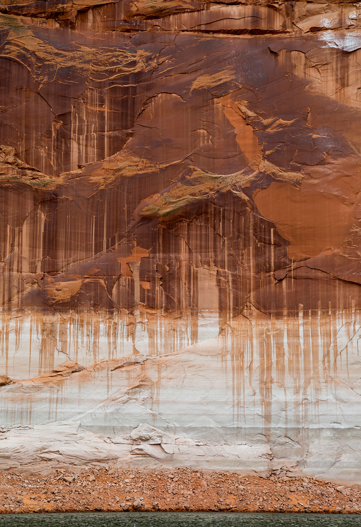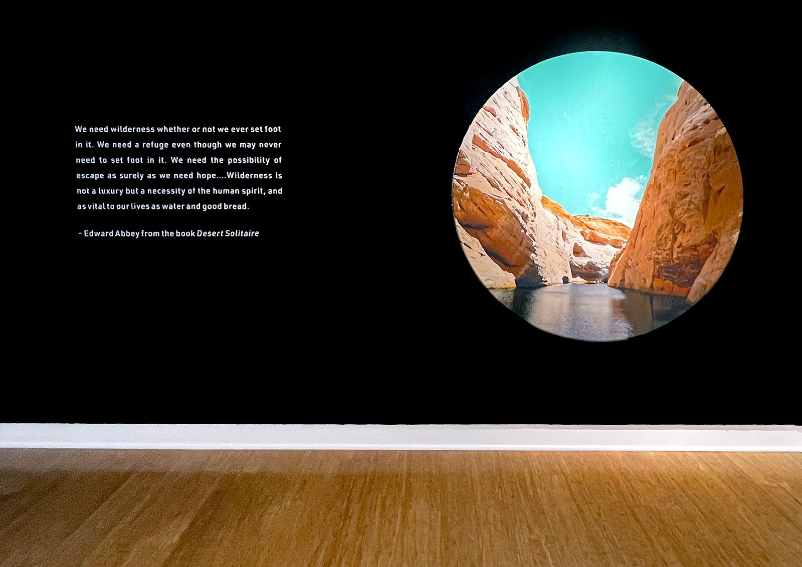 The viewer arrives at the final destination. “Black Water (The Exquisite Side of the Precipice)” is at the end of this escape route, where a captivating landscape towers above an abyss of dark water. This work, based on a photograph taken on Lake Powell, is very ambiguous. It’s a striking piece, but I’m also interested in the fact that Lake Powell is an artificial lake that was created by flooding a valley that had its own ecosystem, thereby disrupting it. All species there perished or had to relocate. This lake is also currently 75 percent empty due to climate change. The superficial beauty we see is in deep contrast to past destructive actions and their consequences. This piece reflects on the precarity of our relationship to water while also acknowledging water as a symbol of life and renewal.