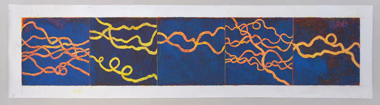 About then, I painted “Roiling Seas 1” and “Roiling Seas 2”. “Roiling Seas 1” shows a deep blue set of squares, each one representing one of the world’s seas. The ropelike forms that I carved into those squares with a knife reveal the warm colors under the blue water. The arrangement of forms creates the illusion of floating in the sea or over it. Those orange-yellow forms suggest knots, but also paths through the water. They even suggest swimmers.